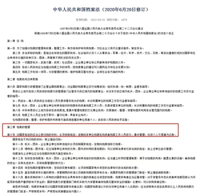 《中華人民共和國檔案法》(2020年6月20日修訂)第三章第十條。檔案管理中明確規定:檔案應通過檔案工作人員移交,集中管理,任何人不得據為己有!